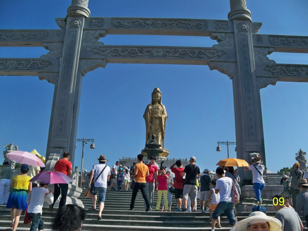 大(dà)家(jiā)先後參觀了(le)觀音(yīn)古洞、二龜聽(tīng)法石、磐陀石、心字石、普濟禅寺、法雨(yǔ)寺、慧濟寺、紫竹林(lín)景區(q™ū)、不(bù)肯去(qù)觀音(yīn)院、潮音(yīn)洞等;并瞻仰普陀山(shān)标志(zhì)§性——南(nán)海(hǎi)觀音(yīn)銅像。