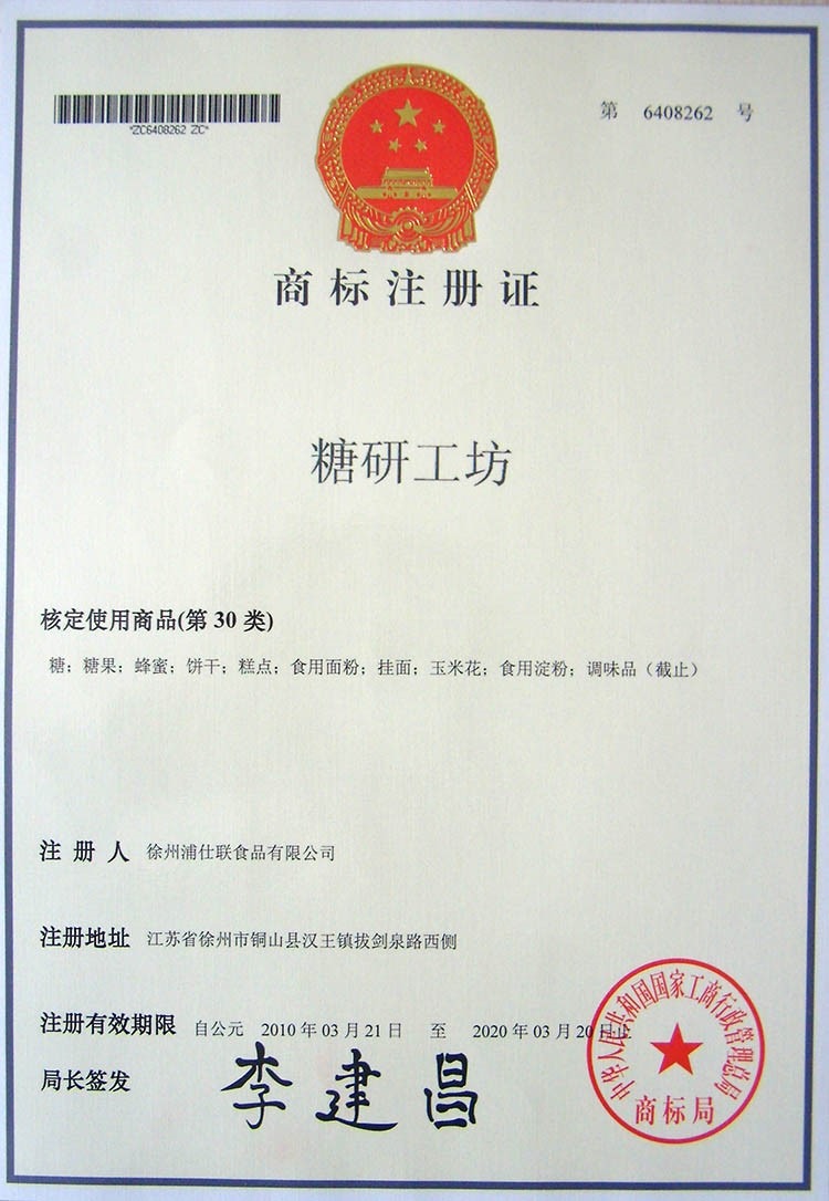 近(jìn)日(rì),公司申請(qǐng)的(de)“滬生(shēng)堂”和(hé)“糖研工(gōng)坊”二個↑(gè)商标獲得(de)中華人(rén)民(mín)共和(hé)國(guó)工(gōng)商行(xíng)政管理(lǐ)總局商标局的(de)批準,正式成為(←wèi)注冊商标。有(yǒu)效期:自(zì)2010年(nián)3月(yuè)21日(rì)至2×020年(nián)3月(yuè)20日(rì)止,有(yǒu)效期10年(nián)。